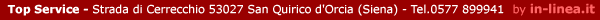 Top Service si trova a San Quirico (Siena) in località Cerrecchio, a poche centinaia di metri dal bivio per Pienza della statale Cassia, nel cuore della famosa ed incontaminata Val d'Orcia.